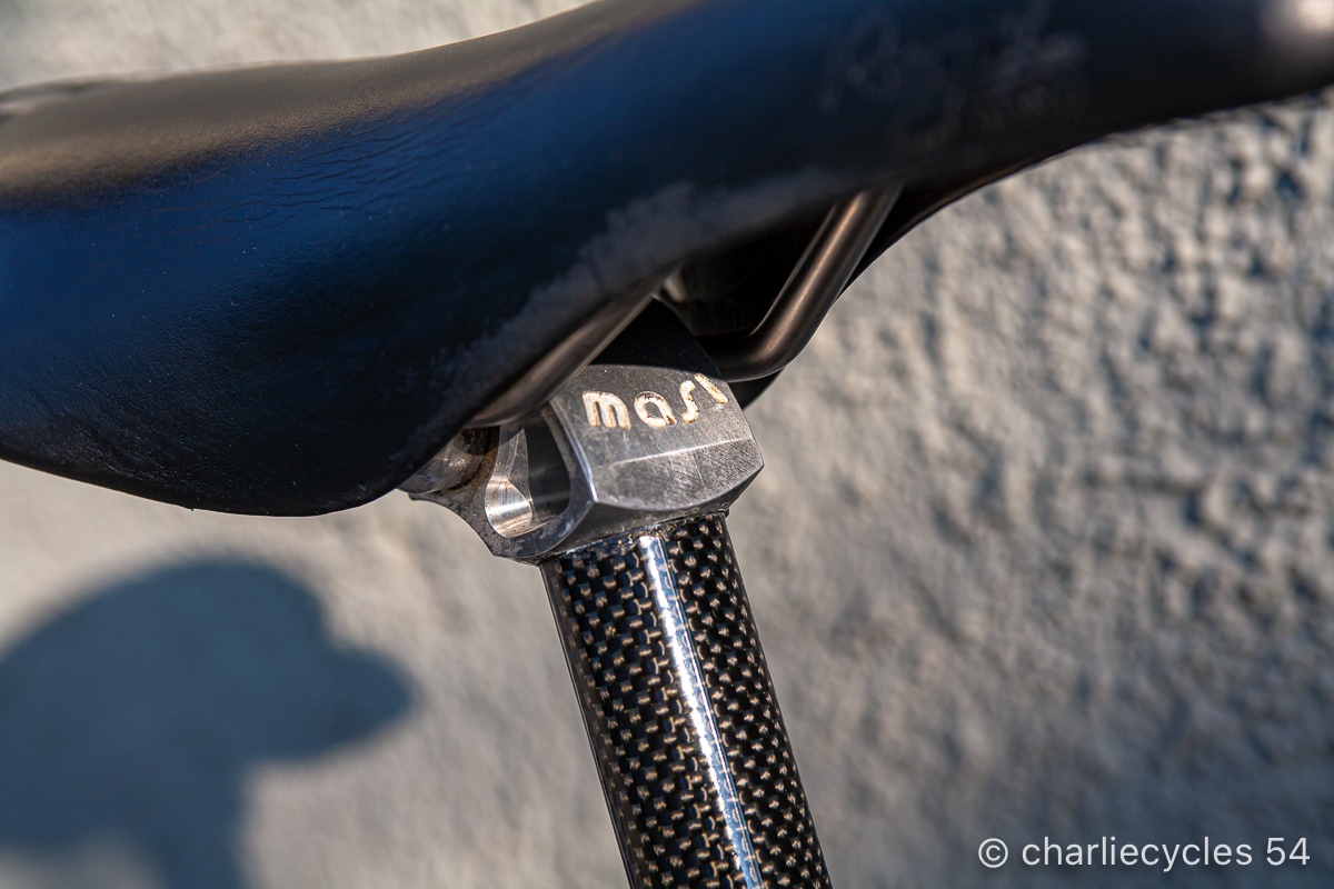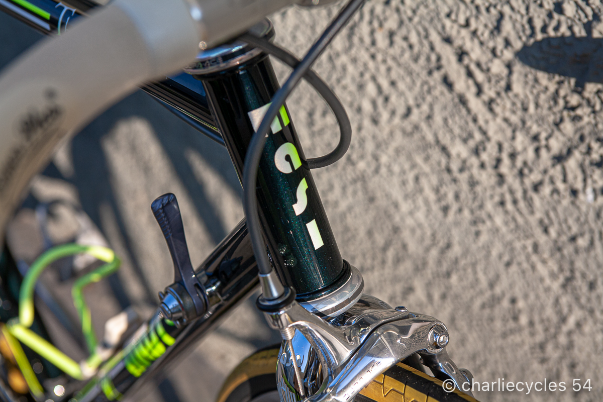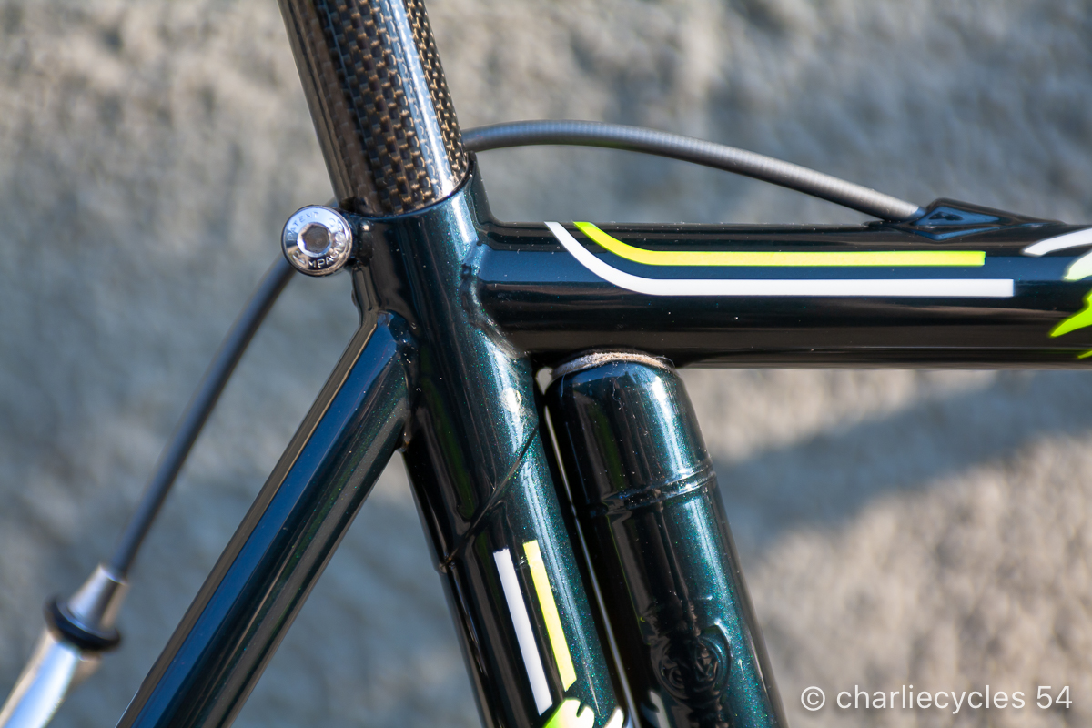 Metà anni ’90 Masi 3v tig modello The Queen, Gruppo Shimano Dura Ace. Particolari la testa forcella e la pipa con la pantografia che rappresenta il Duomo di Milano.